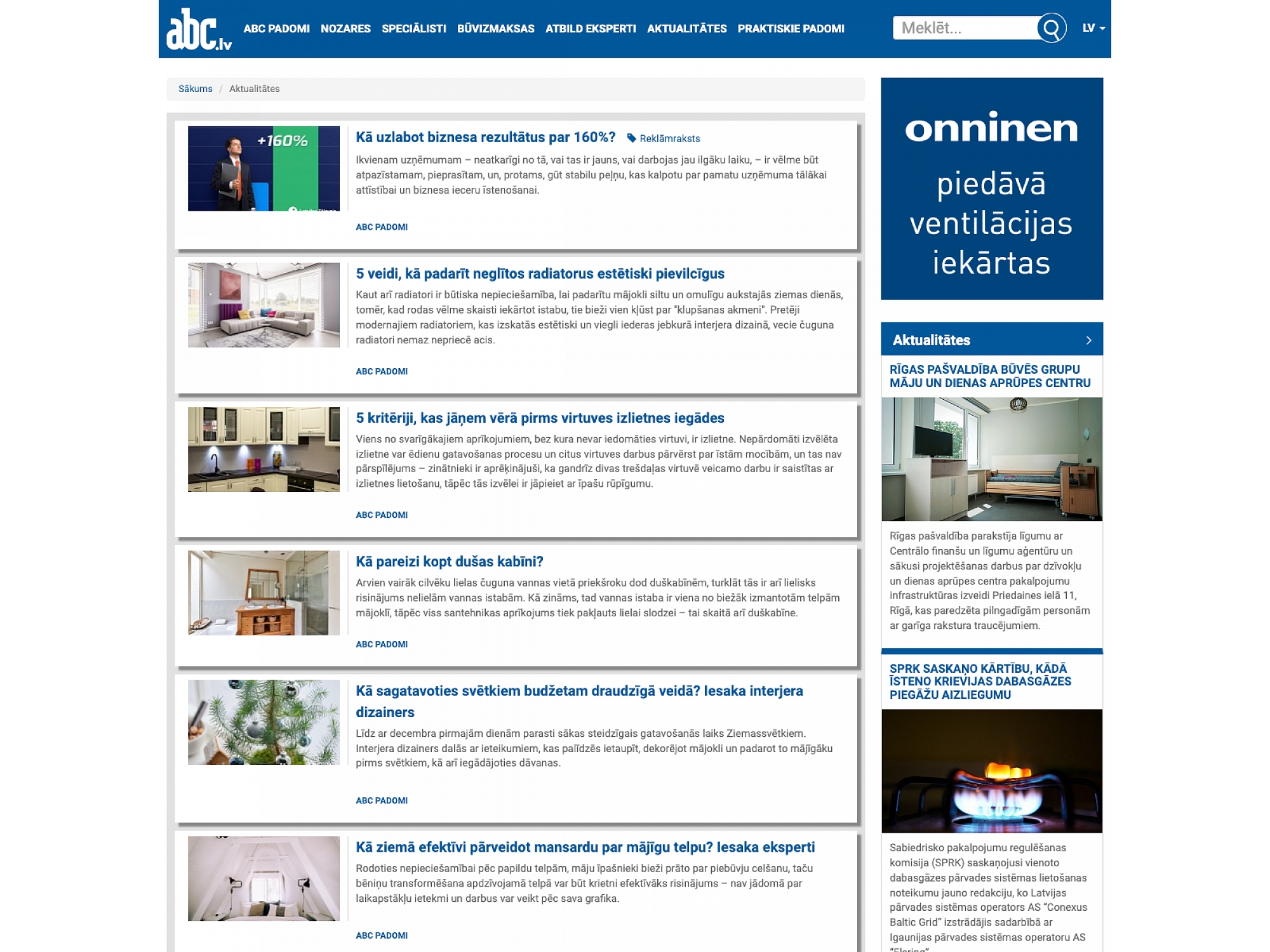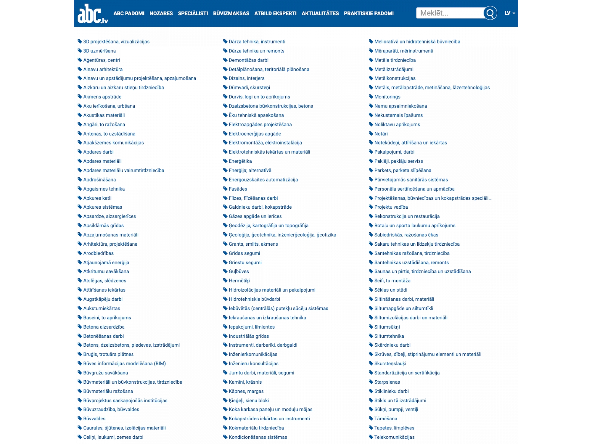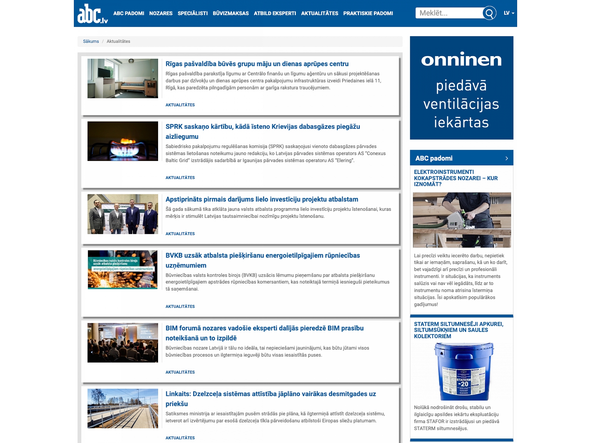Vērtīgi padomi ikvienam, kas būvē, remontē, labo un restaurē, aktuālās būvizmaksas, nozares jaunumi un speciālistu saraksti, kā arī informācija par vairāk nekā 25 000 būvniecības jomas uzņēmumu. Ja tev ir būvniecības nozares uzņēmums - tava mērķauditorija ir portālā abc.lv! Pastāsti par savu pakalpojumu vai preci, uzlabo atrodamību, stiprini reputāciju un iegūsti jaunus klientus, izvietojot portālā biznesa profilu, rakstus un banerus, kā arī izmantojot citus digitālā mārketinga risinājumus!