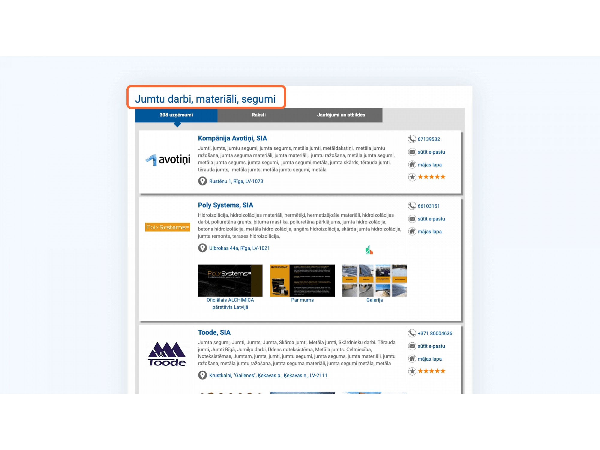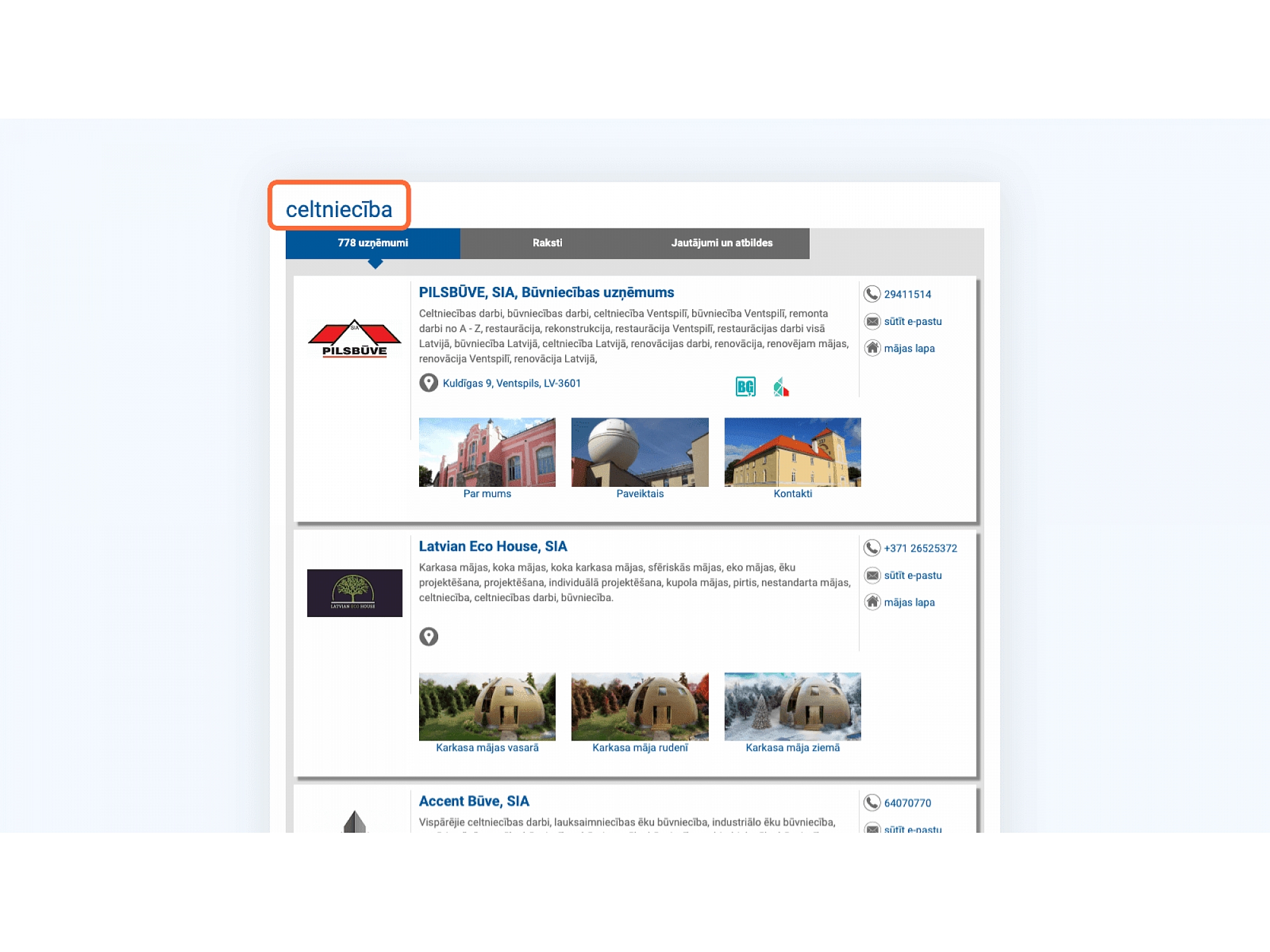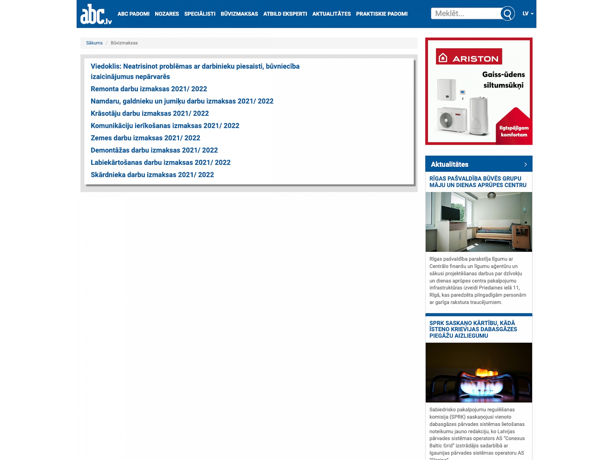 Vērtīgi padomi ikvienam, kas būvē, remontē, labo un restaurē, aktuālās būvizmaksas, nozares jaunumi un speciālistu saraksti, kā arī informācija par vairāk nekā 25 000 būvniecības jomas uzņēmumu. Ja tev ir būvniecības nozares uzņēmums - tava mērķauditorija ir portālā abc.lv! Pastāsti par savu pakalpojumu vai preci, uzlabo atrodamību, stiprini reputāciju un iegūsti jaunus klientus, izvietojot portālā biznesa profilu, rakstus un banerus, kā arī izmantojot citus digitālā mārketinga risinājumus!
