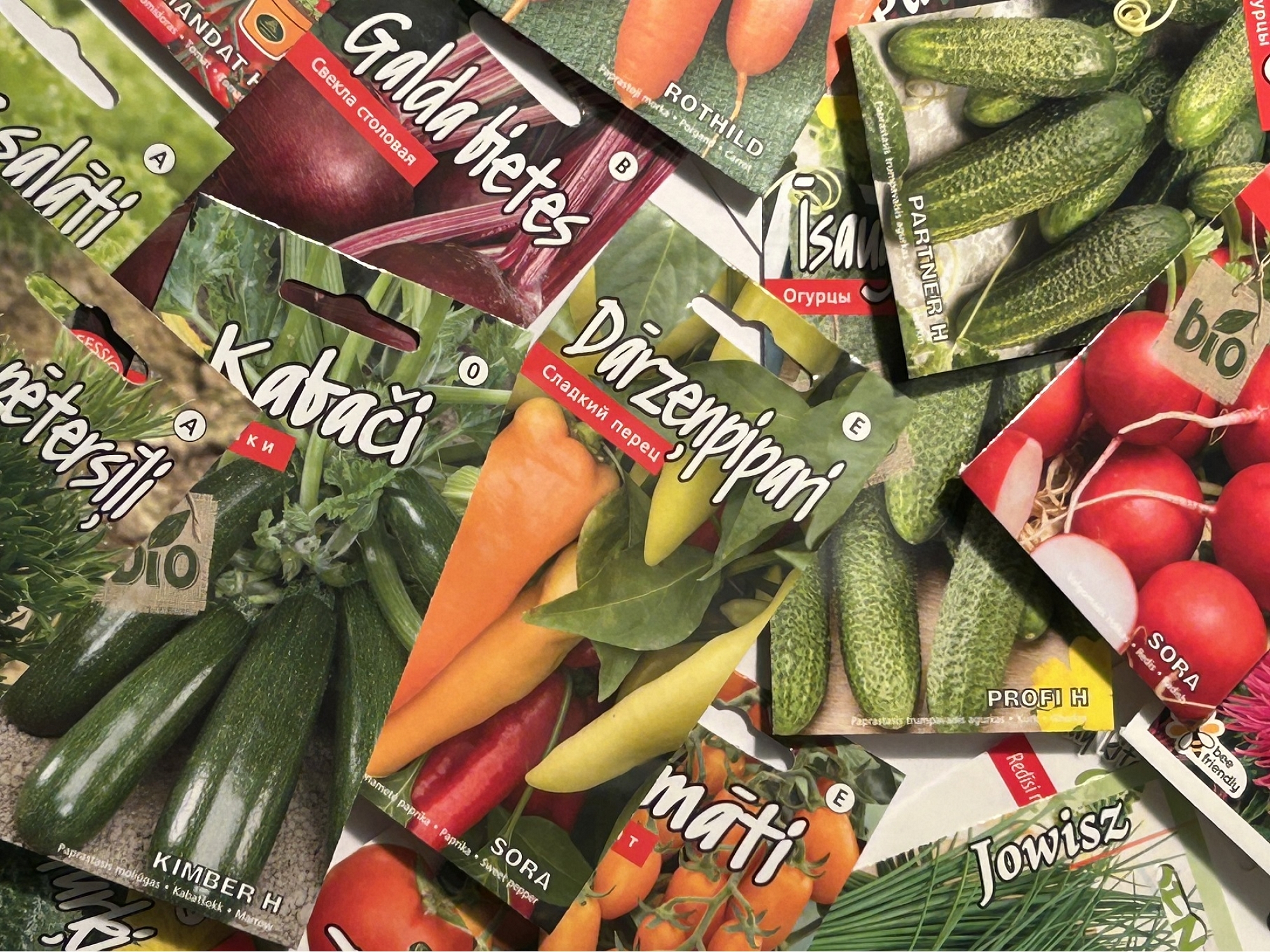 - DĀRZEŅU SĒKLAS: burkāni, arbūzi, galda bietes, galda kāļi, gurķi, kabači, kāposti, kolrābji, ķirbji, pipari, patisoni, pētersīļi, pupas, pupiņas, puravi, rāceņi, redīsi, rutki, salāti, skābenes, sīpoli, spināti, tomāti, ziedkāposti, zirņi, cigoriņi, zemenes, dilles, artišoki, melones, selerijas, baklažāni, brokoļi u.c.