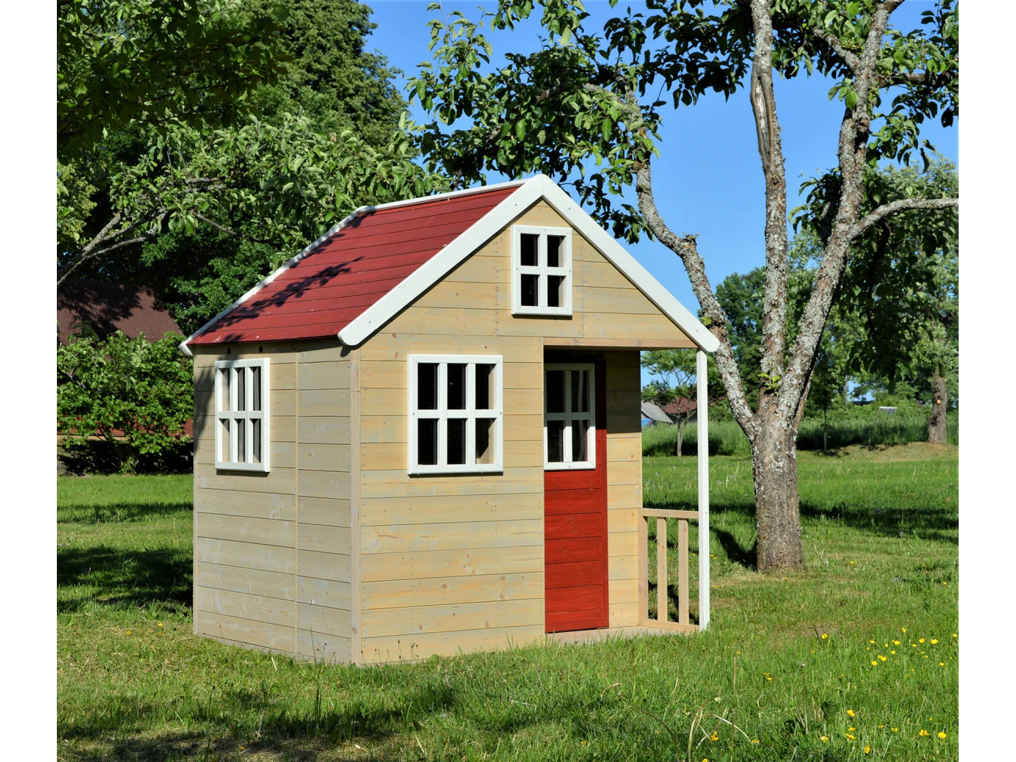 Koka bērnu dārza mājiņa ar verandu